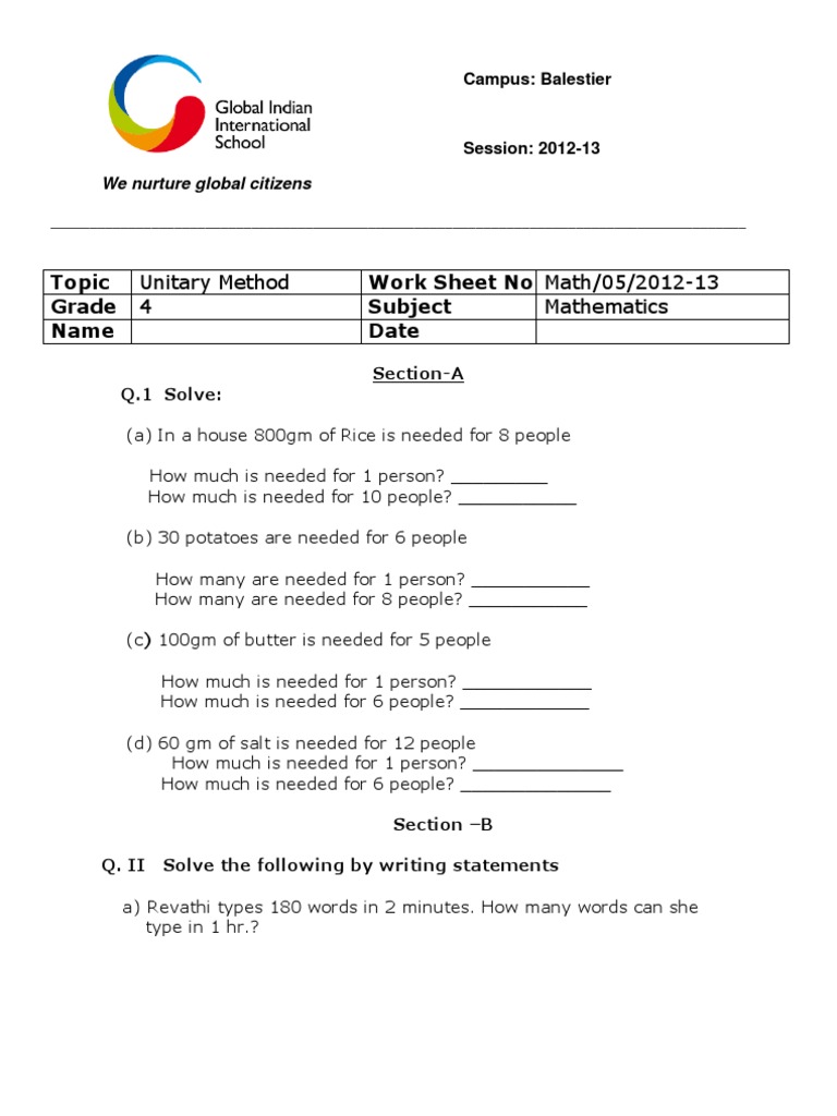 Unitary Method Worksheet - onlinemath4all UNITARY METHOD WORKSHEET. UNITARY METHOD. WORKSHEET. Problem 1 : If 6 note books cost $45, then how much 8 note books costs? Problem 2 : The fence of a hospital is to be repainted by a group of workers. If 6 workers can paint 520.2 m of the wall in an hour, then how many meters of the wall will 7 workers paint in an hour? Problem 3 : › worksheets › class-5-maths-worksheetClass 5 Maths Worksheet | Download Free Class 5 Worksheets Class 5 maths worksheets are crucial as more advanced concepts like decimals and factors are introduced along with ratios and percentages. These worksheets challenge students to develop efficient ways to tackle these topics. Geometry will also feature prominently in the worksheet as students start dealing with lines and angles. Grade 6 Unitary Method Worksheets - K12 Workbook Grade 6 Unitary Method, Displaying all worksheets related to - Grade 6 Unitary Method. Worksheets are Grade 6 math word problems with percents, , Ratio word problems work, Maths quest, Unitary method class 4, Lesson plan fractions, Grade 4 unitary method, Unitary method grade 4. *Click on Open button to open and print to worksheet. 1.
